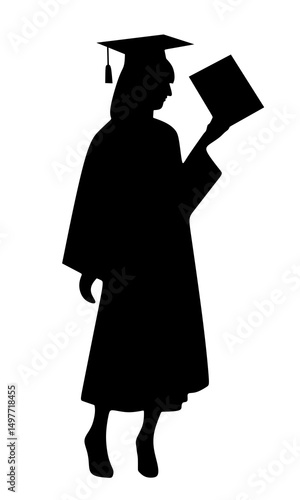 silhouette of woman wearing a toga and graduation cap while holding a diploma