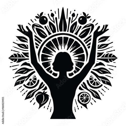 Silhouette of woman with arms raised amidst circular design of fruits and leaves symbolizing healthy living Nutrition Coaching silhouette