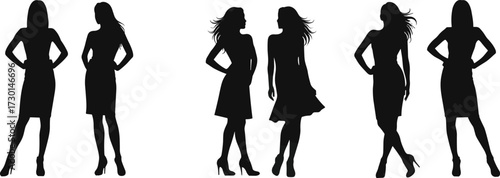 Silhouette of women, female figures standing, stylish pose outline, modern fashion shadow, elegant ladies vector, black isolated illustration design