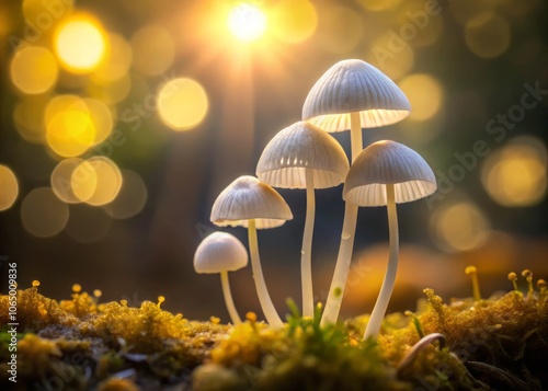 Silhouette Photography of Close-Up Small White Mushrooms Against a Gentle Backlight, Capturing Intricate Details and Natural Beauty in a Minimalist Style
