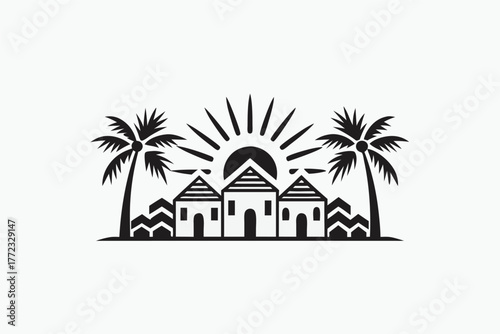 Silhouette portrays three huts amidst palm trees beneath a radiant sun in a simple scene