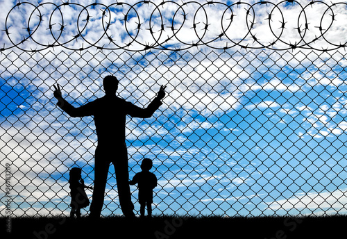 Silhouette refugees father and two children
