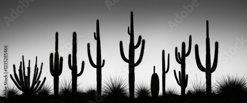 Silhouetted cacti stand tall against a desert sky, showcasing the beauty of the arid landscape.