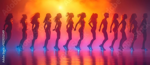 Silhouetted dancers in vibrant lighting create a dynamic and energetic atmosphere.