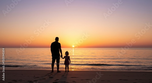 Silhouetted Father and Child Holding Hands by Ocean at Dusk