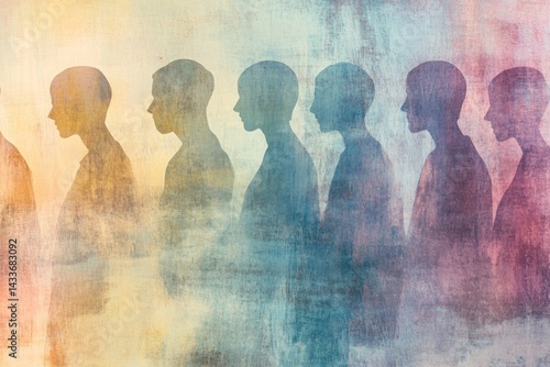 Silhouetted Figures in Sequential Formation Against Abstract Background