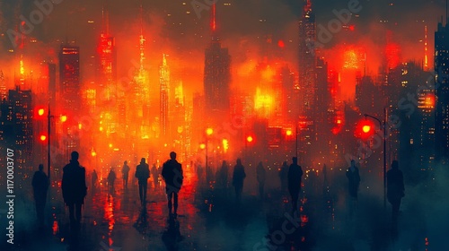 Silhouetted Figures Walking Through A Fiery Cityscape
