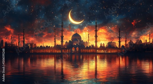 Silhouetted Mosque with Minarets Reflecting in a Lake at Sunset