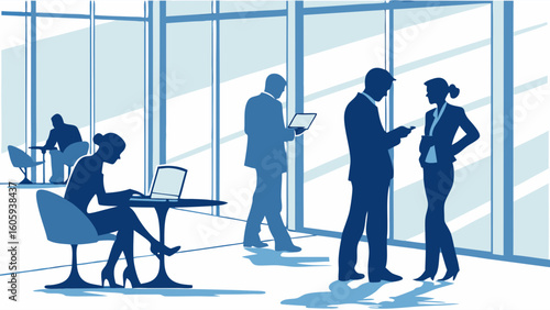 Silhouetted Professionals Engaged in Discussion and Technology Use in Modern