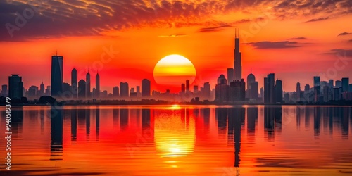 Silhouetted Skyline Reflecting in a Sunset-Colored Lake, Cityscape , Architecture , Sunset