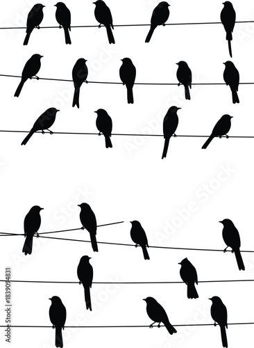 Silhouettes of birds on wires, perched in groups, minimal design, symmetry, posture variation, nature observation, peaceful composition, wildlife pattern