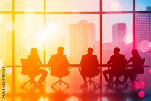 Silhouettes of business people in a modern conference room, overlooking a vibrant city skyline during a sunset meeting.