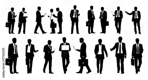 Silhouettes of business people in various poses, holding briefcases and papers.