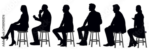 Silhouettes of business people, men and women sitting on stool full length. Vector illustration isolated on transparent background.