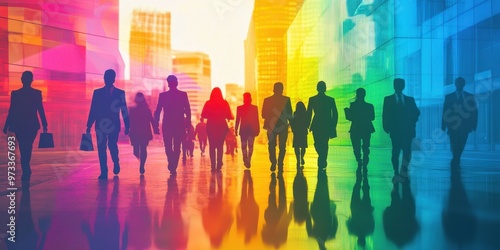 Silhouettes of business people with a gradient color background A modern office building can be seen on the left side Generative AI