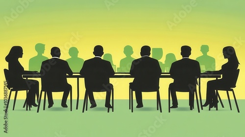 Silhouettes of businesspeople at a meeting table, discussing strategies and ideas in a corporate setting with a vibrant background.