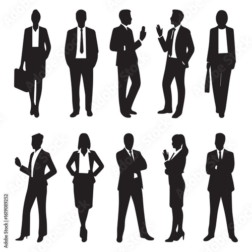 Silhouettes of diverse business people isolated on white background, representing teamwork, professionalism, and corporate success in a modern office environment