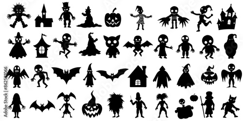 Silhouettes of halloween characters on white background. A collection of Halloween character silhouettes set against a white background, featuring various hairstyles, facial expressions, and gestures