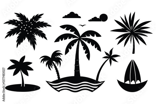 Silhouettes of palm trees on a tropical beach with sun, sea, and sand, creating a paradise landscape