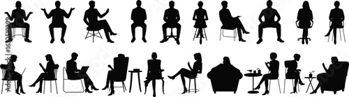 Silhouettes of people sitting in various postures on chairs, working, talking, drinking coffee – office, casual, home vector set