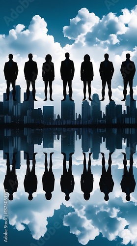Silhouettes of people standing against a dramatic sky with city skyline reflection in water, symbolizing teamwork, unity, community, and urban lifestyle in a surreal artistic scene