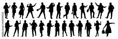 Silhouettes of people standing, walking, gesturing. Group of diverse adults silhouettes