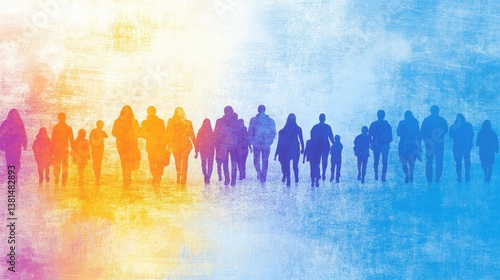 Silhouettes of people walking in a crowd, colorful background