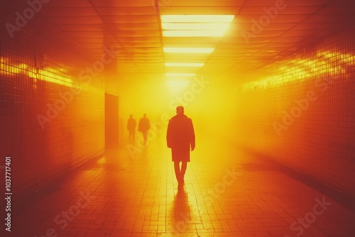 Silhouettes of People Walking Through a Foggy Tunnel Lit by Warm Light