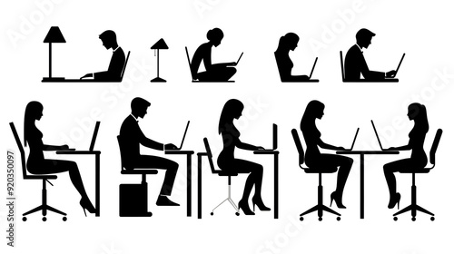 Silhouettes of people working on laptops in various postures and settings.