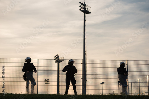 Silhouettes of policemen standing next to the football field (inscription in Polish Police)