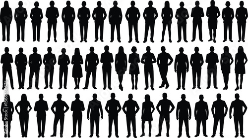 Silhouettes of professional business people standing in rows, diverse team, corporate group, isolated on white background, ideal for presentation, teamwork, career design