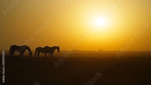 Silhouettes of Two Horses Grazing in a Golden Sunset