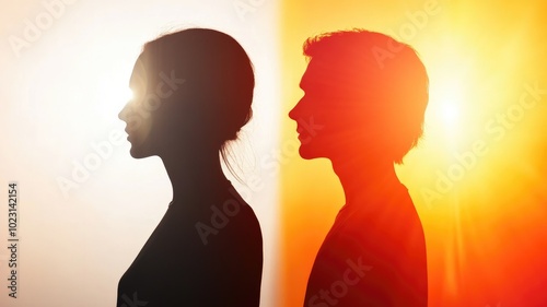 Silhouettes of woman and man facing opposite directions in contrasting light