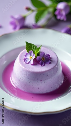 Silky lavender panna cotta, delicate floral garnish , spoon, floral, delicious