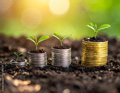 Silver and gold coins with green leaves and soil, economic growth concept.