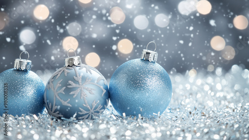 Silver background with blue Christmas ornaments and snowflakes, creating an elegant festive atmosphere. Sparkling lights for visual appeal. Perfect wallpaper or Christmas banner for holiday promotion.