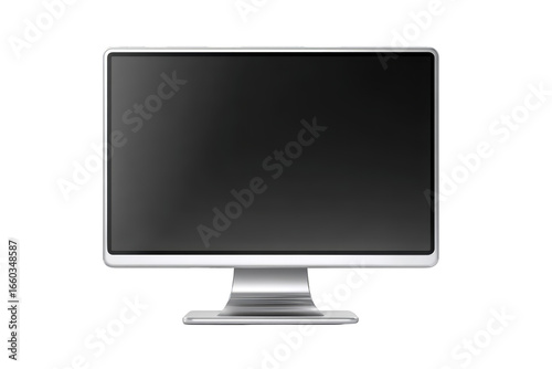 Silver computer screen with a black, blank display and a white stand
