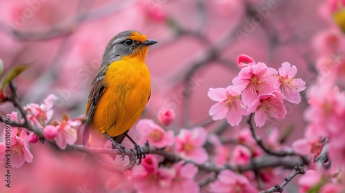 Silver Eared Mesia on Cherry Blossom Branch: Beautiful Yellow Bird with Silver Ears Perching
