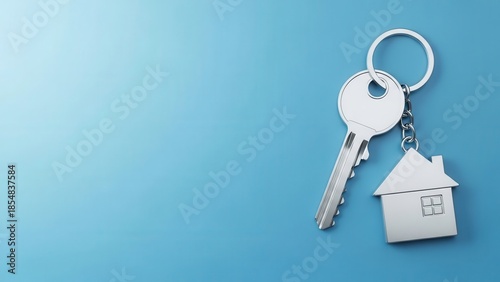 Silver House Key with House-Shaped Keychain on a Solid Blue Background with Copy Space