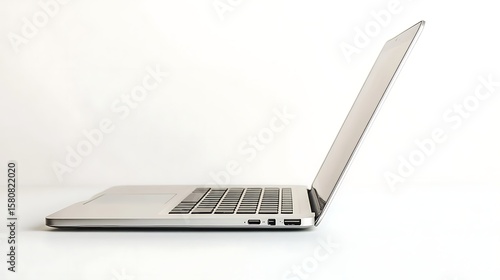 Silver Laptop Side View Sleek Design, Ports, and Keyboard on White Background