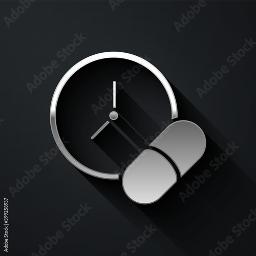 Silver Medicine pill or tablet icon isolated on black background. Capsule pill and drug sign. Pharmacy design. Long shadow style. Vector.