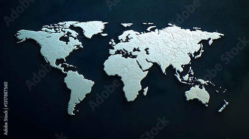 Silver Metallic Textured World Map On Dark Blue Background 3D Render Illustration For Global Connectivity