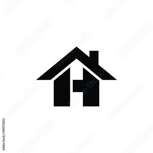 Simple black and white house icon with a chimney and door