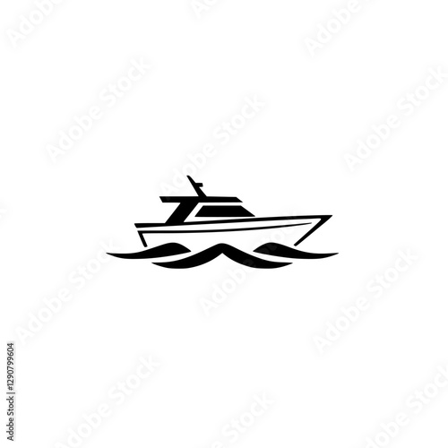 Simple black and white logo of a boat in motion upon water with stylized waves.