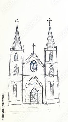 Simple Black And White Sketch Of A Religious Building With Two Tall Spired Towers in Religious Art Style And Architectural Style of Europe Regions and Medieval Time Period. The Image Has a White