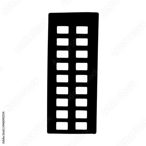 Simple black drawing of a tall building with many windows depicted