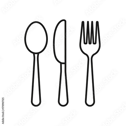 Simple black outline illustration of a spoon, knife, and fork, arranged in a horizontal row.