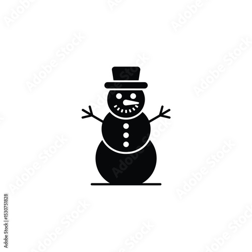Simple Black Snowman Icon with Hat, Buttons, Carrot Nose Isolated on White