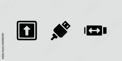 Simple Black Vector Icons Representing Uploading USB Connection and Resizing on a Clean Gray Background