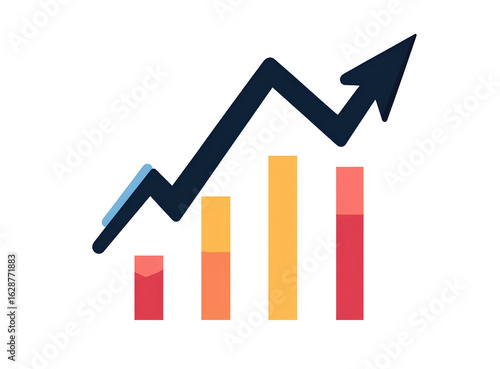Simple flat color vector art of an upward graph on a white background, with a navy blue arrow pointing up and to the right.